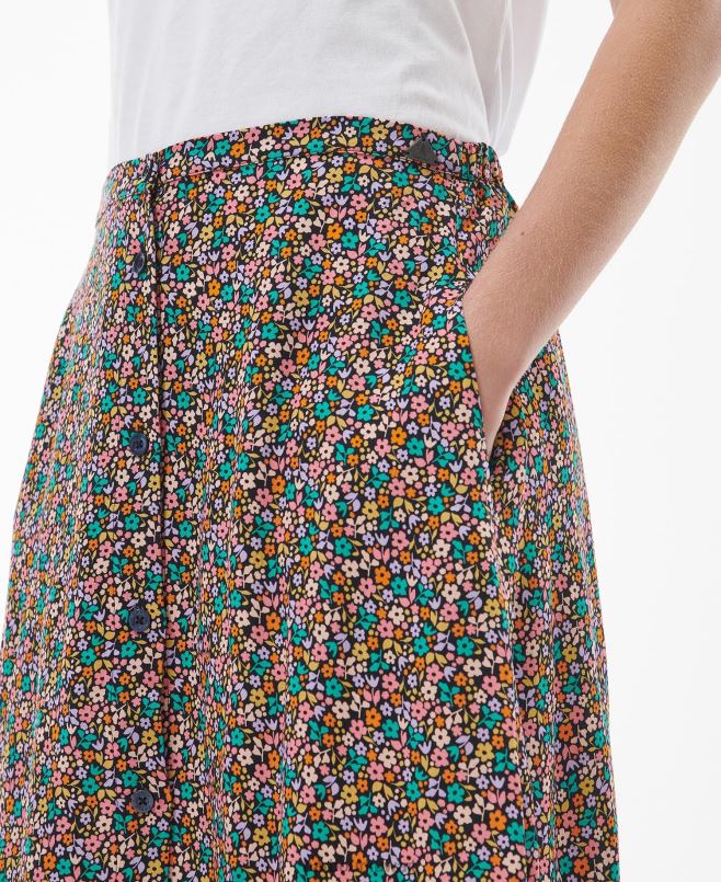 تنورة باربور انجلسي مع أزرار بوقي مزينة بشعار الماركة على بلاكيت. مثالية للاقتران مع الأحذية الرياضية أو الصنادل ، هذه التنورة