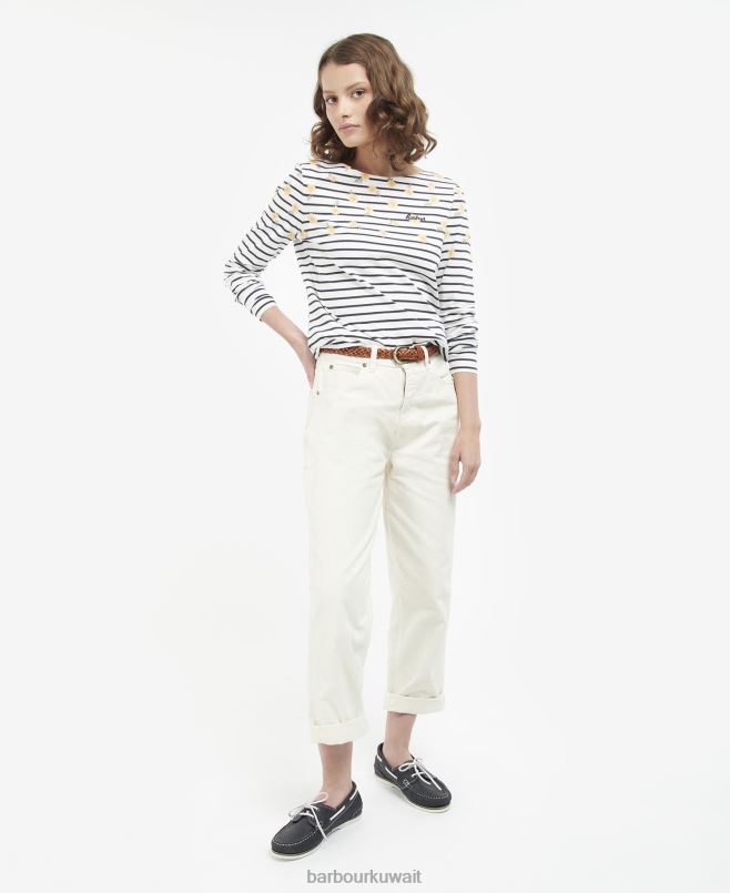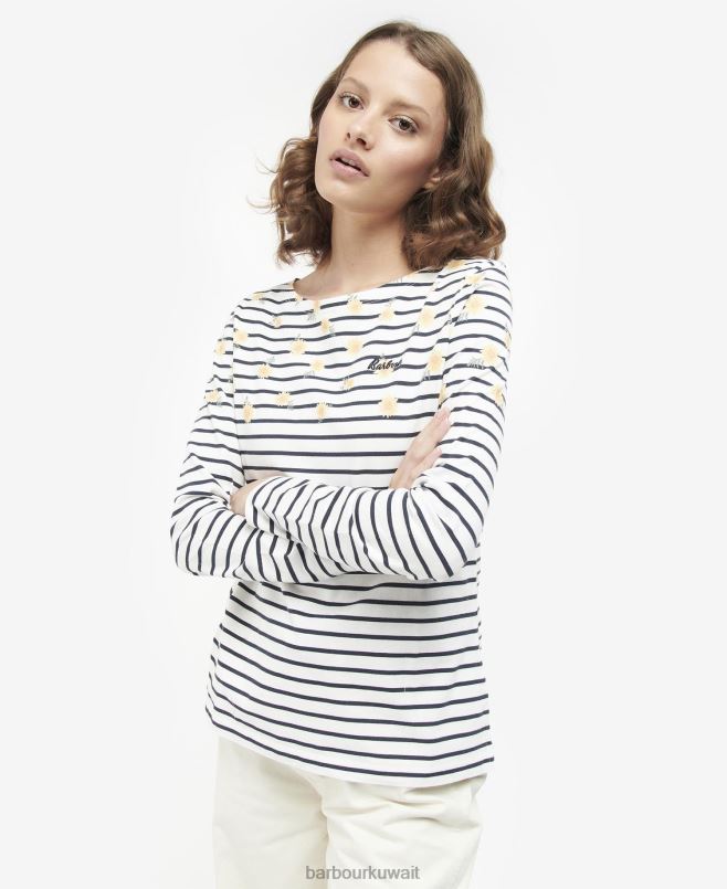 نسخة معاصرة من بلوزات البحارة المخططة الكلاسيكية ، هذا الإصدار من بلوزة باربور برادلي الشهيرة مزينة بنمط متكرر لطيف على الصدر والكتفين ، مستوحى من المجموعات الساحلية والريفية. مقلم باللون الكحلي ، يتميز الجزء العلوي برقبة عريضة للقارب للحصول على صورة ظلية جذابة. مثالي للارتداء مع الجينز أو الشينو لإطلالة أنيقة بدون مجهود ، بلمسة نهائية بسيطة بشعار مطرز صغير على الصدر الأيسر ، ارتفاع الموديل 5'11 '' ، مقاس 10