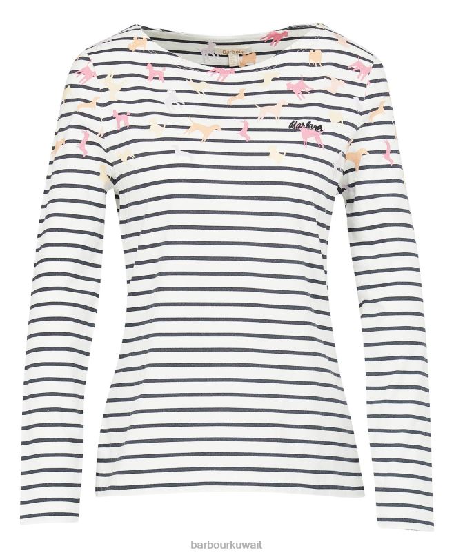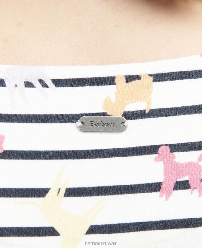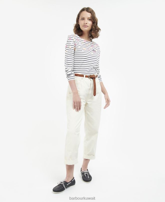 نسخة معاصرة من بلوزات البحارة المخططة الكلاسيكية ، هذا الإصدار من بلوزة باربور برادلي الشهيرة مزينة بنمط متكرر لطيف على الصدر والكتفين ، مستوحى من المجموعات الساحلية والريفية. مقلم باللون الكحلي ، يتميز الجزء العلوي برقبة عريضة للقارب للحصول على صورة ظلية جذابة. مثالي للارتداء مع الجينز أو الشينو لإطلالة أنيقة بدون مجهود ، بلمسة نهائية بسيطة بشعار مطرز صغير على الصدر الأيسر ، ارتفاع الموديل 5'11 '' ، مقاس 10