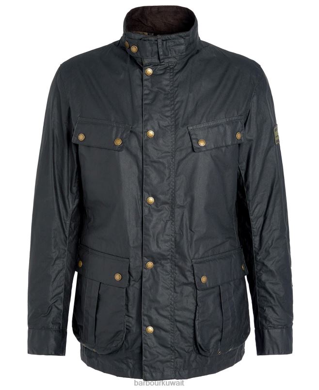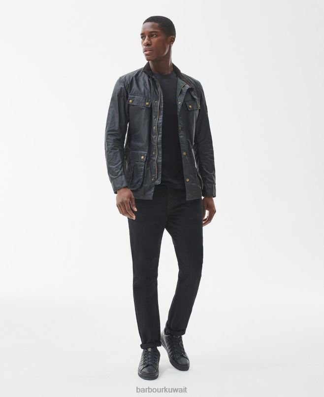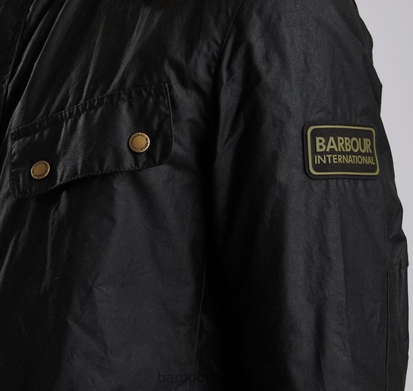 جاكيت خفيف الوزن من القطن المشمع من Barbour international مع جيوب صدر بزاوية وجيبين منخفضين بطيات. إنه مزود ببطانة قطنية خفيفة الوزن ، وبطانة من ياقة سروال قصير وأربطة مسمار بلون ذهبي في جميع الأنحاء لإطلالة كلاسيكية.